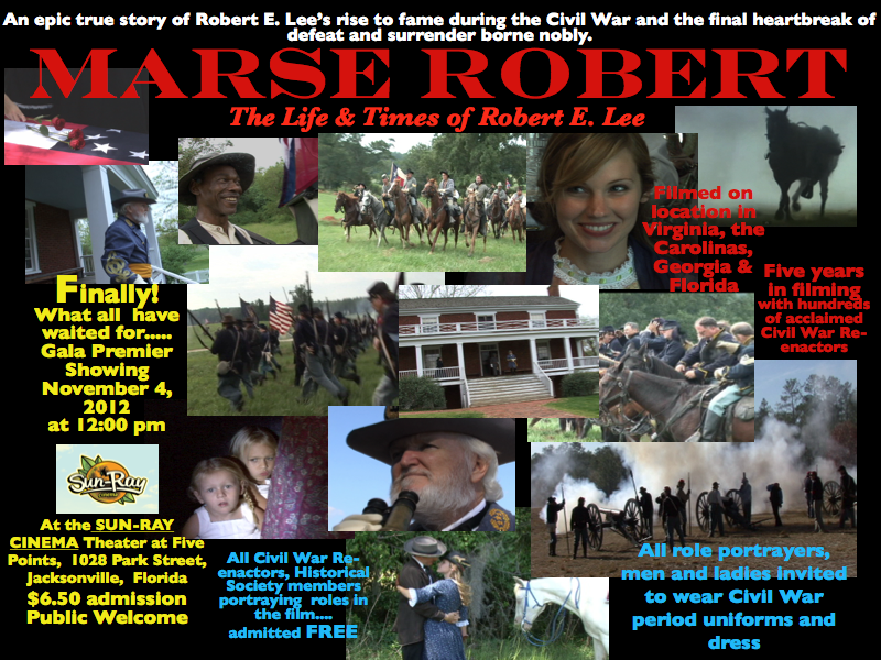 The film, Marse Robert, includes participation by Civil War Re-enactors, historical society members, drama students, role players and portrayers from Virginia, the Carolinas, Georgia and Florida, and especially in North Florida in the counties of Clay, Duval, Putnam & Nassau.
