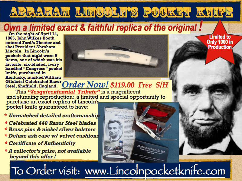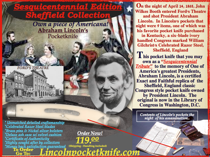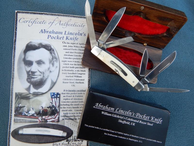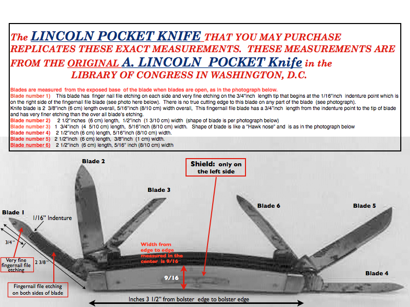 This Exact & Faithful renewed manufactor of the LINCOLN POCKET KNIFE is a 6- blade "Congress" w/ nickel mounting & Sheffield, England, Wm. Gilchrist's Celebrated Razor Steel marked on the base of each blade.