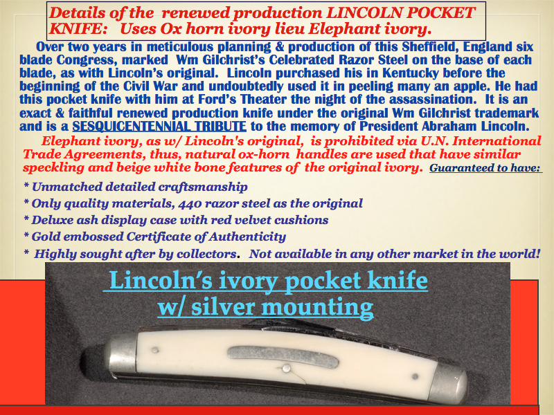 Elephant ivory, as in Lincoln's orginal, is prohibited via International Trade Agreements, thus, natural ox-horn handles are used that have similar speckling and beige white bone features of the original ivory. Guaranteed to have: